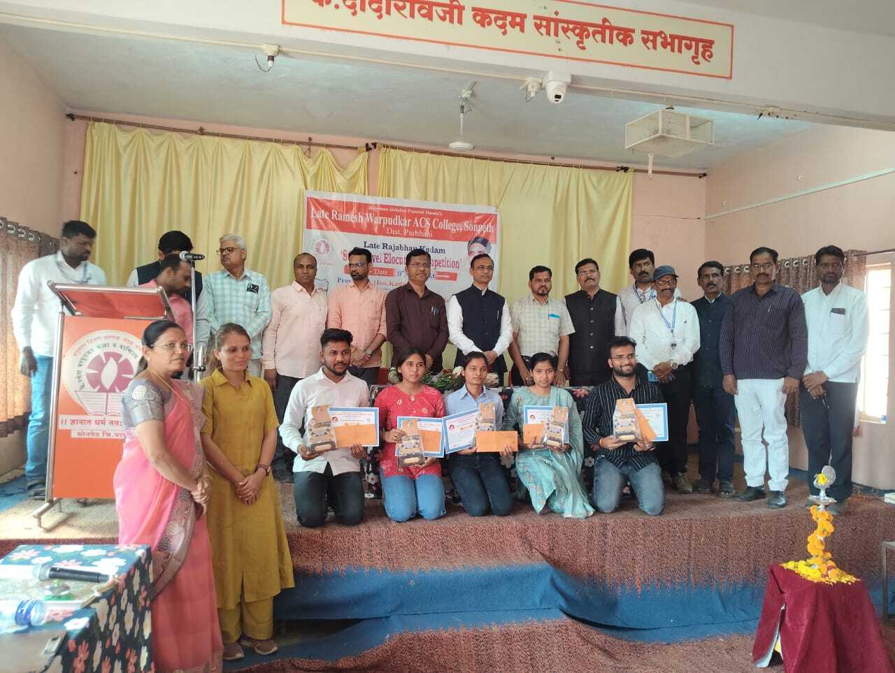 कै.रमेश वरपूडकर महाविद्यालय सोनपेठ येथे आयोजित राज्यस्तरीय वक्तृत्व स्पर्धेत आपल्या महाविद्यालयाची विद्यार्थिनी सानिका सतीश मगर हिने पहिले पारितोषिक पटकावले आहे. 5000 रु. सन्मान चिन्ह असं पारितोषिकाचे स्वरूप आहे सानिकाचे अभिनंदन